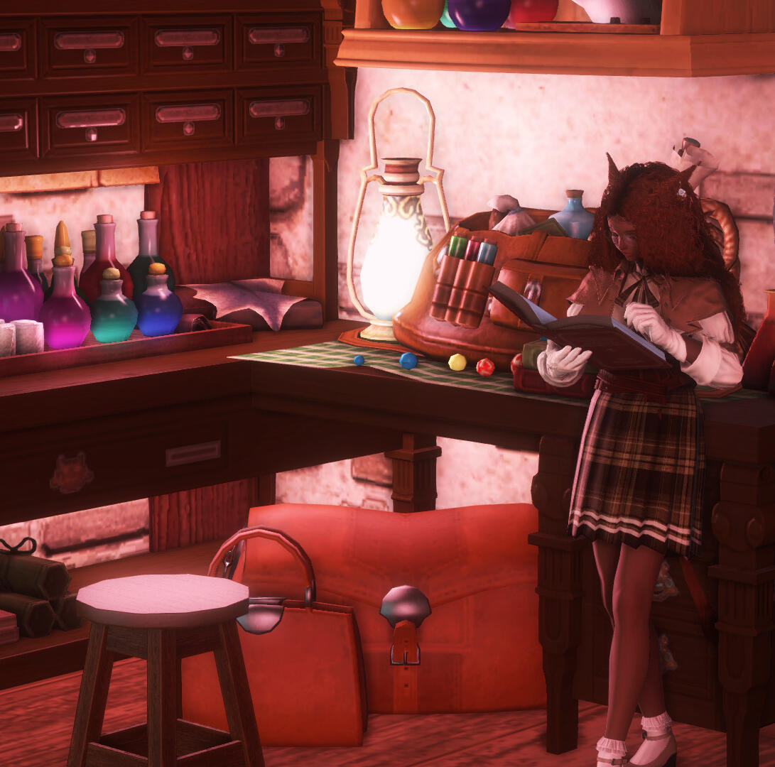 Out Foraging: Her occasional return to Gridania is usually spent in The Shroud, restocking materials and reagents for her potions. (For more dangerous trips, Motte will seek out mercenaries to protect or assist her)